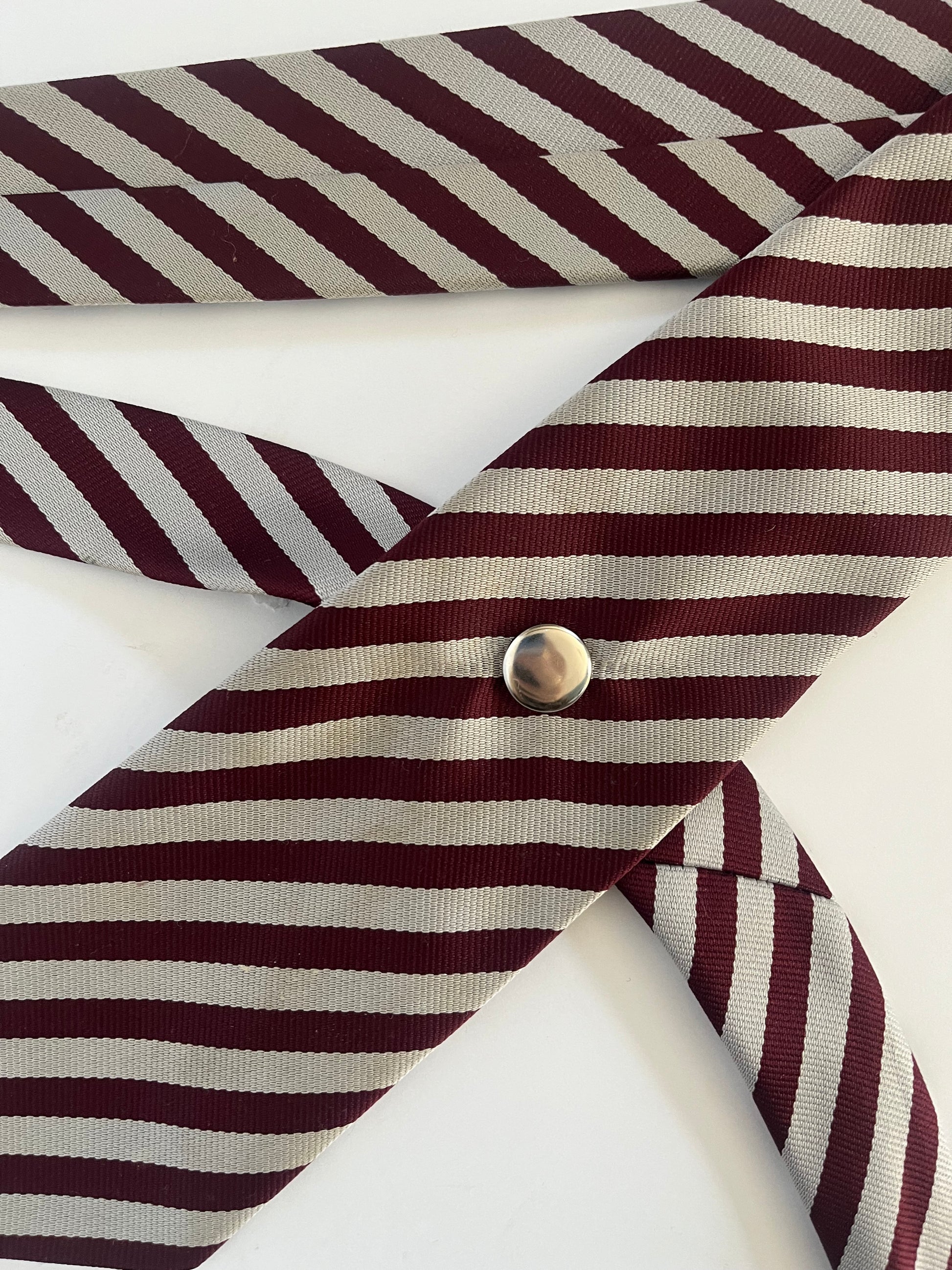 Burgundy and grey stripe tie belt. Hand made in London from reworked second hand ties, non adjustable.