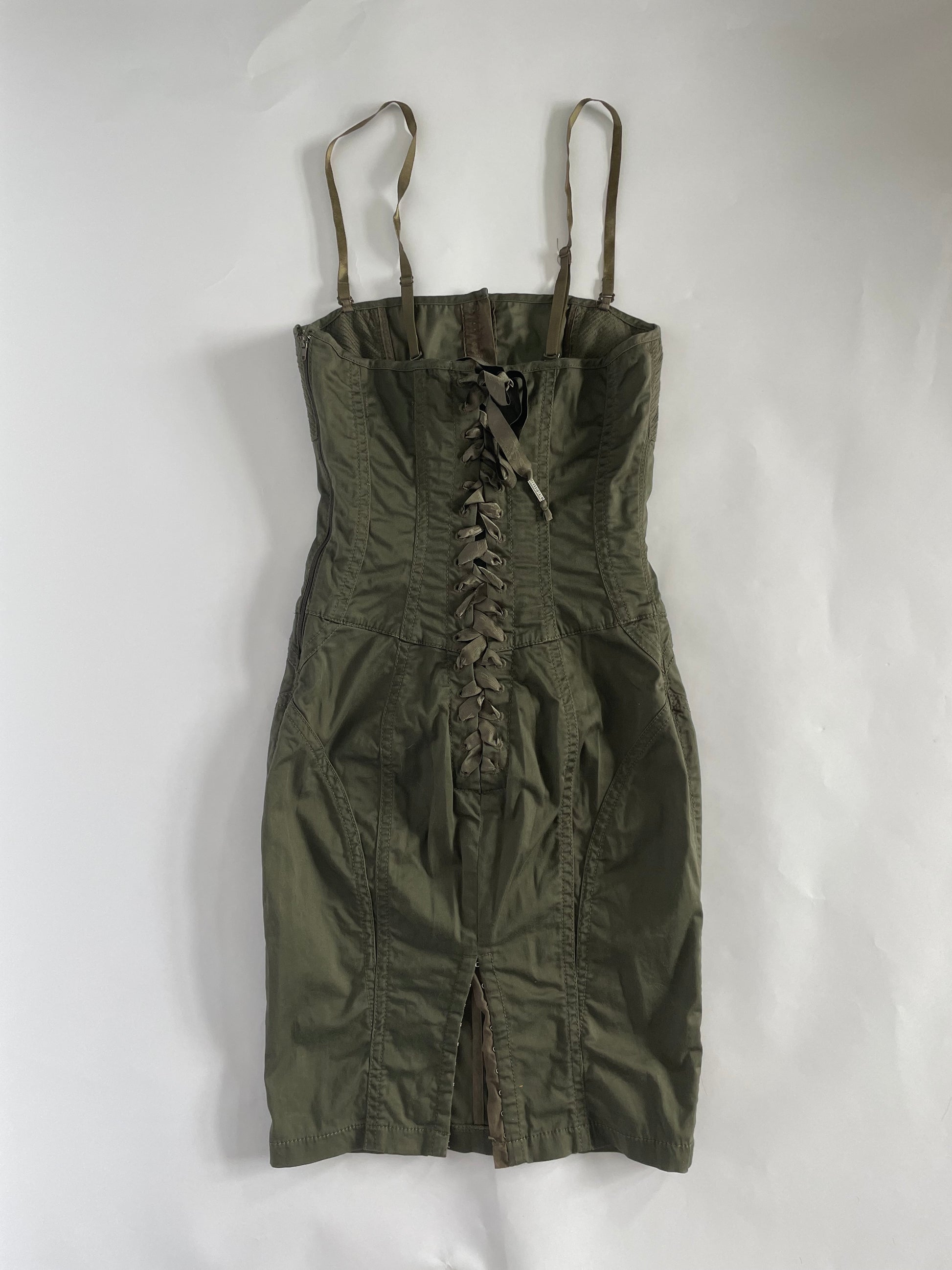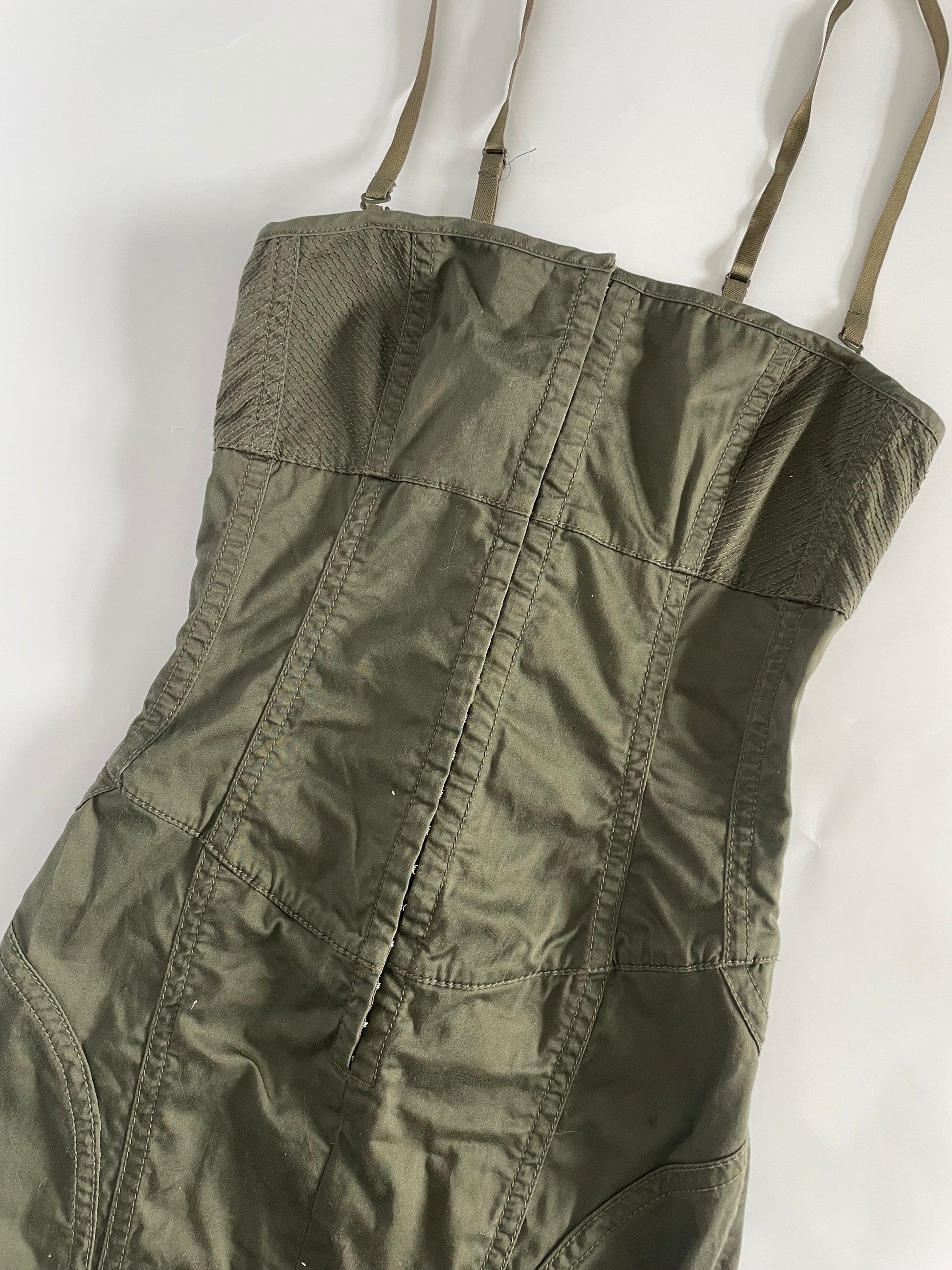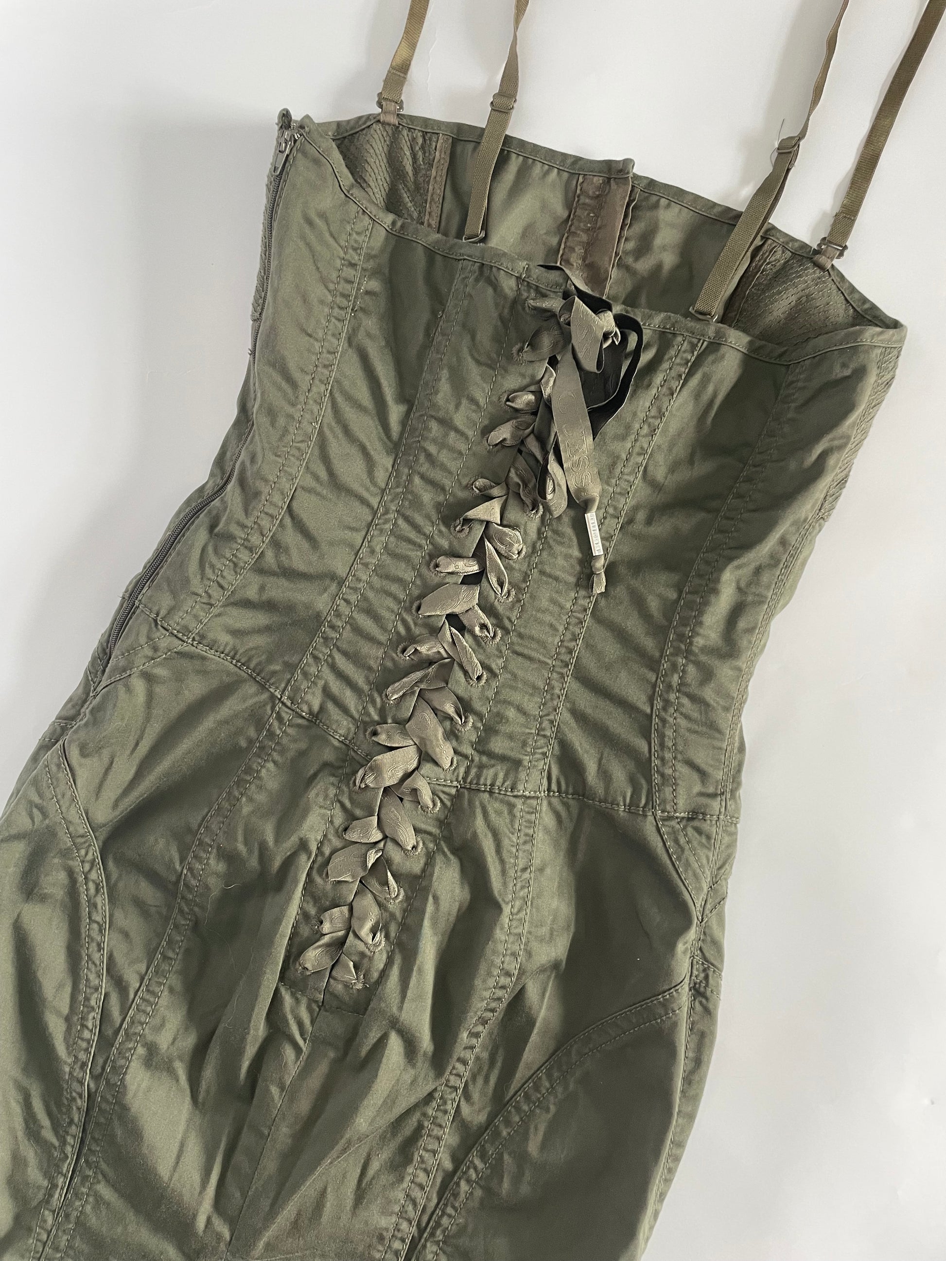 90’s guess khaki corset mini dress. Lace up back, hook and eye front and hook and eye on the bottom of the back